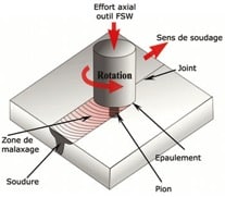 Un outil de forme cylindrique tourne à vitesse constante sur la ligne de contact entre les pièces à souder, ce qui provoque un « ramollissement » des matériaux. L’outil avance alors dans le plan de joint et mélange les matériaux, créant ainsi une zone soudée.