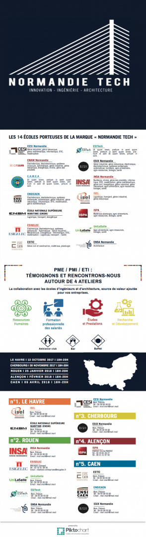 NORMANDIE TECH (les 14 écoles ingénieurs de Normandie) organise un « afterwork tour » du 12 octobre 2017 au 5 avril 2018 dont l’objectif est de faire se rencontrer les écoles et les PME/PME/ETI autour de 4 ateliers :