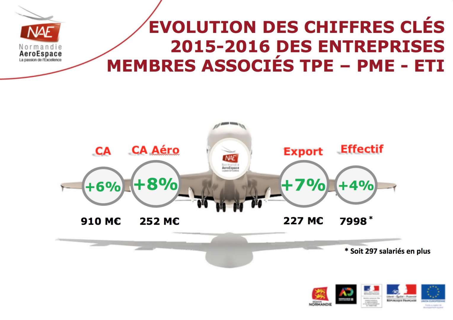 L’évolution du chiffre d’affaires et des effectifs des TPE-PME-ETI de la filière est très favorable : le CA 2016 atteint 984 millions d’euros, en progression de 6% par rapport à 2015, dont 261 millions réalisés en aéronautique, spatial, défense ou sécurité, soit une progression de 8% sur ce segment. Ces résultats normands se démarquent donc très positivement de la moyenne nationale de la filière aéronautique qui affiche une progression de 4.8% sur les activités civiles et de 1.4% sur les activités militaires. Leur chiffre d’affaires à l’export atteint quant à lui 238 millions d’euros, en progression de 7% par rapport à 2015. Enfin, autre signe positif, l’évolution favorable et constante des effectifs de ces entreprises qui atteignent 8470 personnes, en progression de 4%, soit 306 salariés en plus.