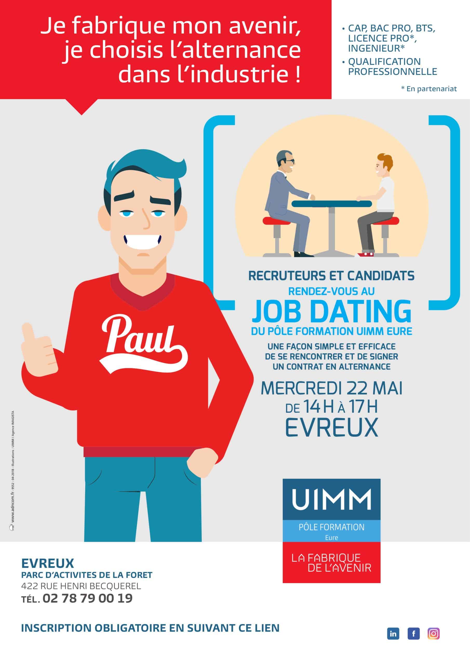 Le job dating de l’alternance dans l’industrie : le 22 mai de 14h à 17h au Pôle formation UIMM de l’Eure à Evreux. L’industrie recrute pour former en alternance. Le Pôle formation UIMM de l’Eure et ses entreprises partenaires se mobilisent et accompagnent les candidats dans leur recherche d’un contrat en alternance pour la rentrée. Le job dating permet aux entreprises et aux candidats de voir un maximum de contacts dans un temps court pour optimiser le processus de recrutement pour la rentrée.