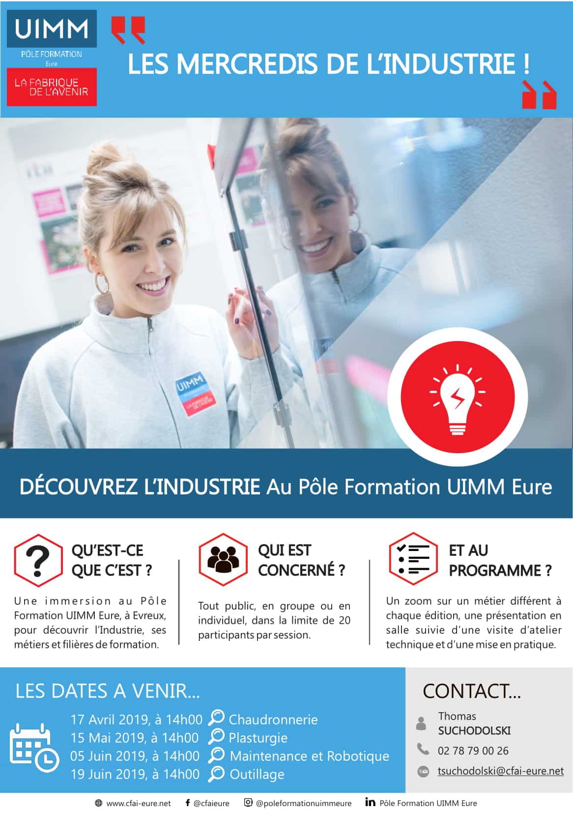 Les mercredis de l’industrie : zoom sur un métier avec une présentation du métier et une immersion en atelier et mise en pratique. Ouvert à tous sur inscription préalable au 02 78 79 00 26.