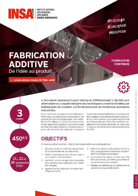 Plus d’informations : 3 jours de formation en Fabrication ADDITIVE – Formation continue- INSA Rouen Normandie