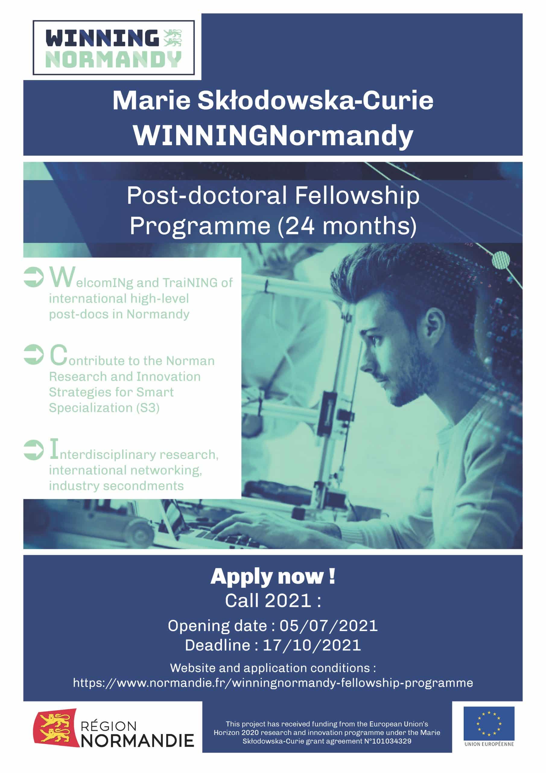 The WINNINGNormandy Fellowship Programme will foster the research excellence and innovation activities, and increase the international attractivity and influence of the Normandy Region in France by recruiting 40 two-year postdoctoral fellowships in two calls. This project has received funding from the European Union’s Horizon 2020 research and innovation programme.